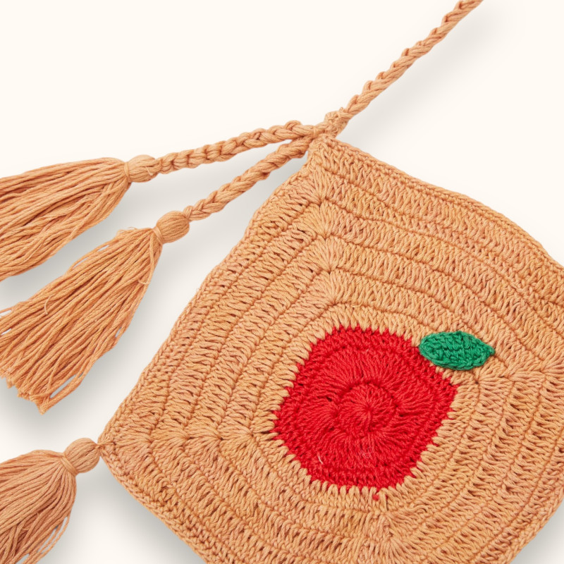 Ce Mini Sac de Poche Naturel Pomme d’Emile & Ida allie simplicité et charme avec son design crocheté en coton naturel orangé. Le sac présente une pomme rouge en son centre, apportant une touche ludique et colorée qui rappelle l’esprit nature et vintage des créations de la marque.