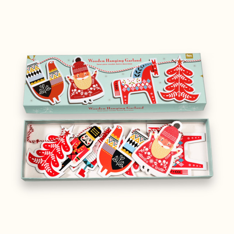 La Guirlande de Noël à Suspendre de REX est un incontournable pour apporter une ambiance festive et chaleureuse à votre intérieur. Fabriquée en bois, elle présente sept motifs traditionnels de Noël, soigneusement découpés et colorés, qui évoquent l'esprit des fêtes.