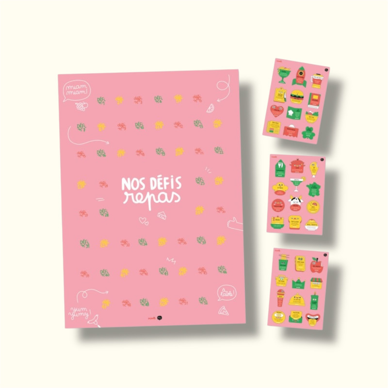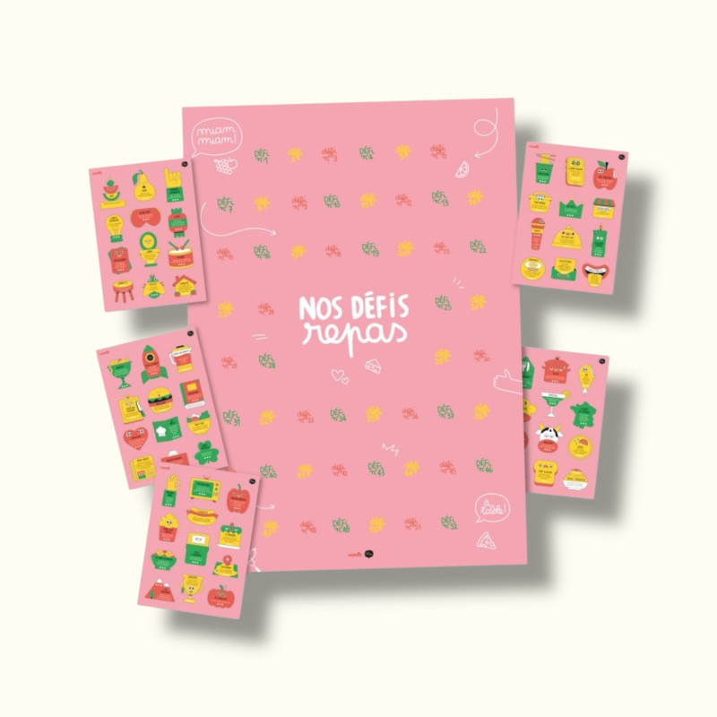 Faites de chaque repas un moment de jeu et de partage ! Avec le poster à sticker "Les défis repas" signé Poppik x Minus, transformez vos repas en un vrai terrain de jeu familial. 52 défis à choisir, coller et relever ensemble pour des repas pleins de rires et de surprises !