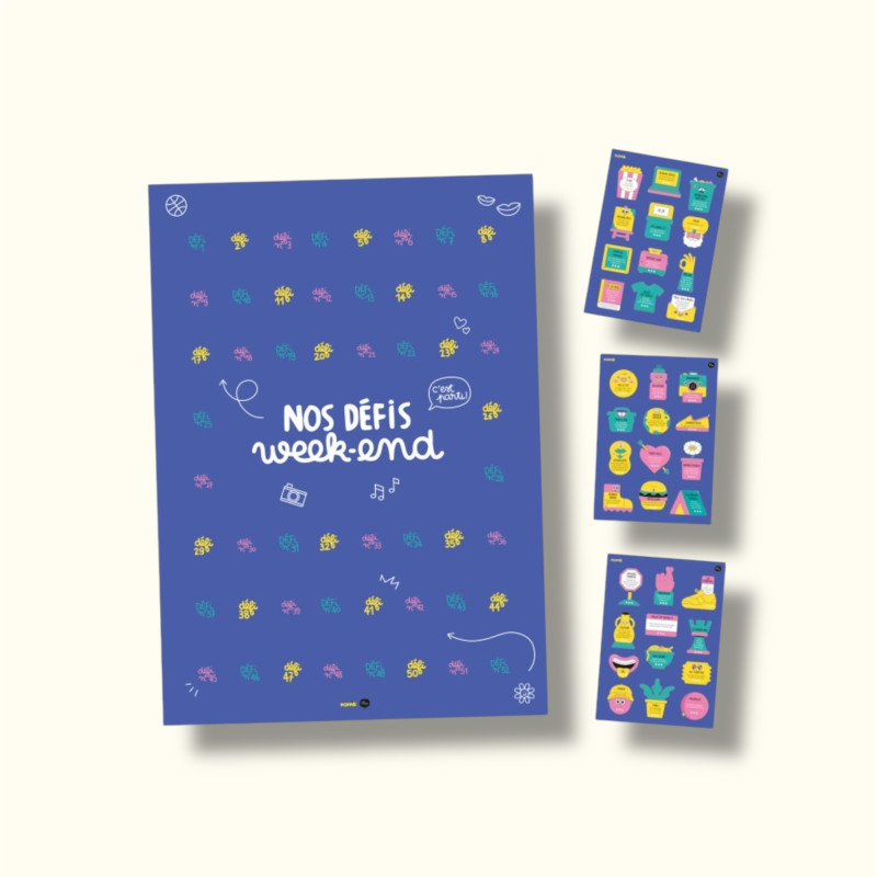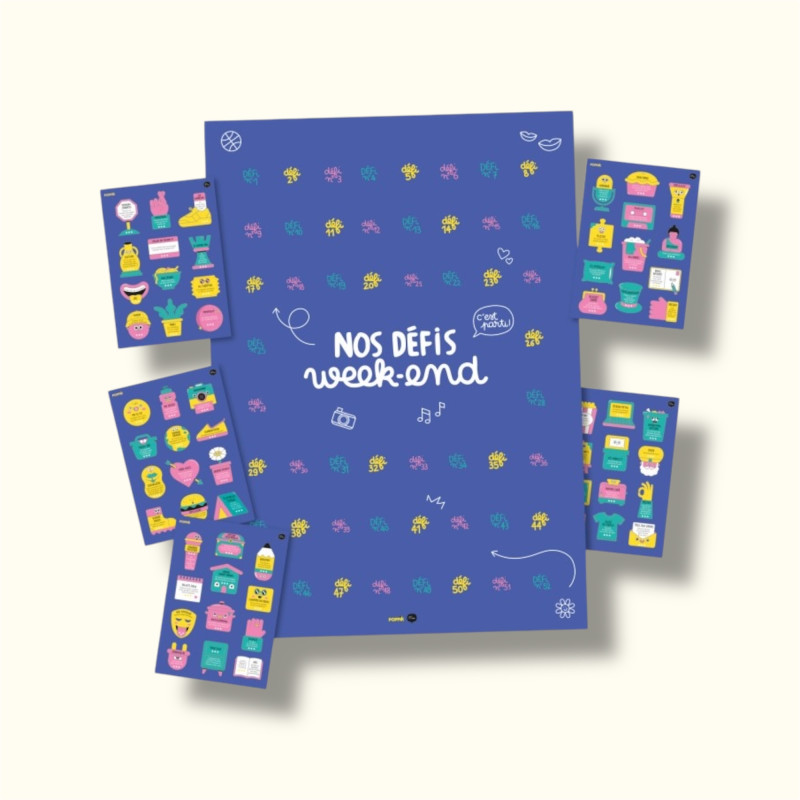 Faites de vos week-ends un concentré de fun et de surprises ! Avec le poster à sticker "Les défis du week-end" signé Poppik x Minus, transformez vos week-ends en une aventure familiale pleine de rires et de défis ludiques. 52 activités originales à choisir, coller et réaliser ensemble pour des moments inoubliables !