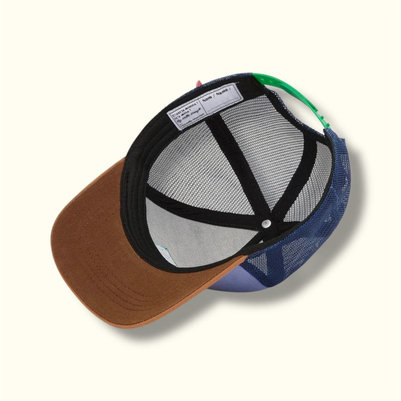 Casquette enfant Mini Marine Hello Hossy : bleu marine, visière camel, tissu respirant. Conçue sans toxiques, avec sangle réglable. À découvrir dans notre sélection de casquettes stylées, ou à assortir avec des modèles comme Mini Anis. Pour les petits matelots au look affirmé.