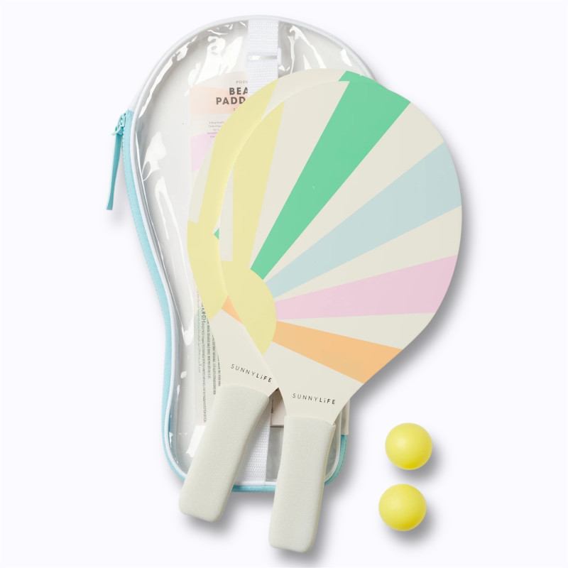 Les raquettes de padel Pastel Gelato Sunnylife combinent un design pastel citron glacé et un set jeu-enfant dès 6 ans. Conçues en mousse EVA légère et robuste, elles comprennent deux raquettes et une balle coordonnée, idéales pour jouer en duo sans installation. Adaptées à la plage, au jardin ou à la piscine, elles se transportent facilement et s’inscrivent dans l’univers ludique de la marque. À associer aux lunettes de natation Sunnylife ou à d’autres accessoires disponibles dans notre sélection. Un jeu coloré, fiable et simple pour des après-midis estivaux joyeux.