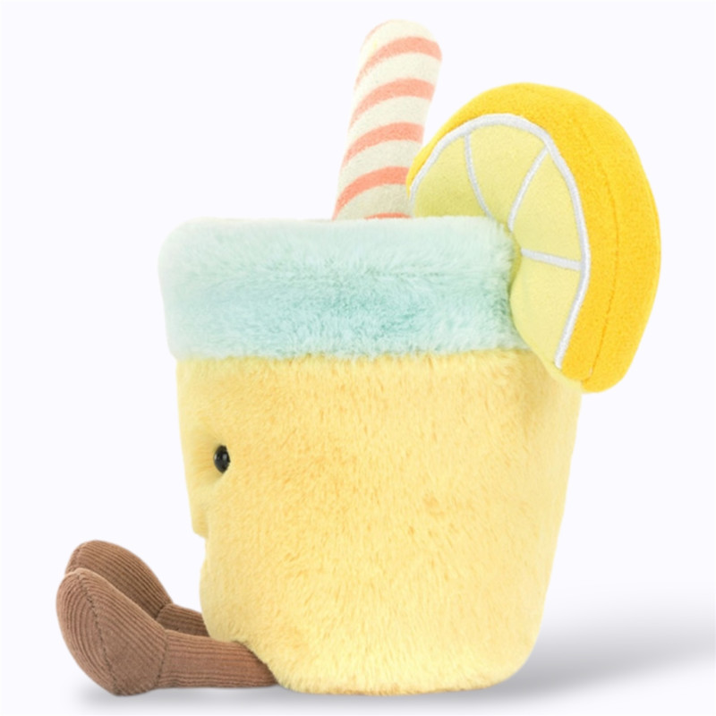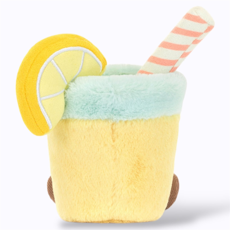 Avec son sourire cousu, sa paille rayée et ses tranches de citron en feutrine, cette peluche est aussi attachante qu’inattendue. Sa texture ultra douce et son format compact la rendent idéale pour les petits câlins ou pour jouer à la dinette version doudou.