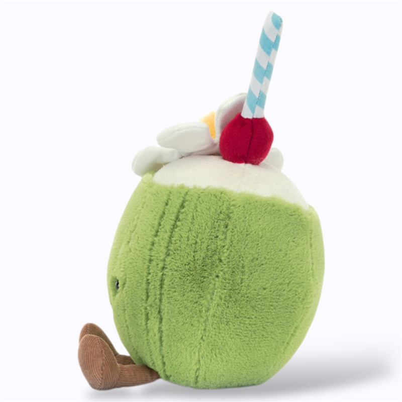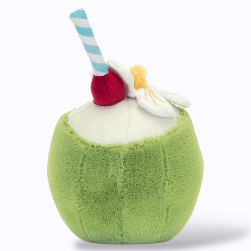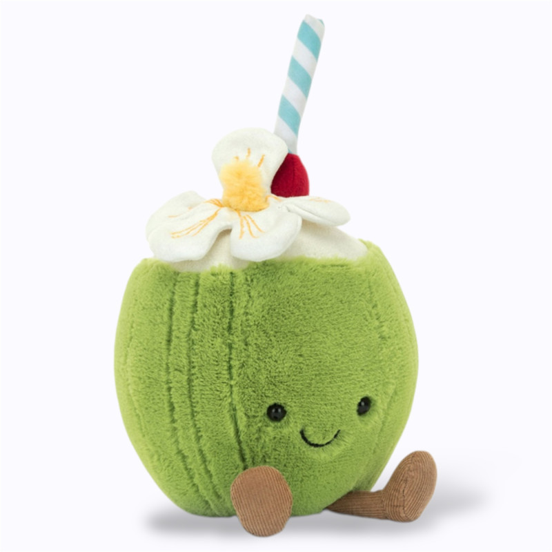 Cette peluche reprend tous les codes d’une boisson tropicale : la coque brune, la mousse blanche en guise de lait de coco, la paille fantaisie et les petits yeux ronds. Elle est parfaite pour des jeux d’imitation, mais aussi pour servir de petit coussin d’appoint sur le lit ou dans un coin lecture.
