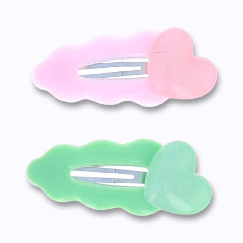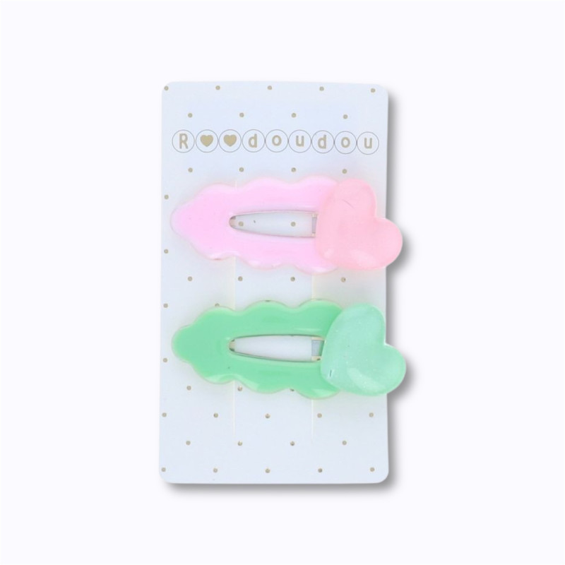 Le lot comprend deux barrettes métalliques ornées de cœurs en résine, l’un rose poudré, l’autre vert tendre. Leur système clic-clac est simple à utiliser, même pour les plus petites mains. Ces barrettes permettent de discipliner une mèche, de fixer une mini tresse ou simplement d’ajouter une note décorative à une coiffure.