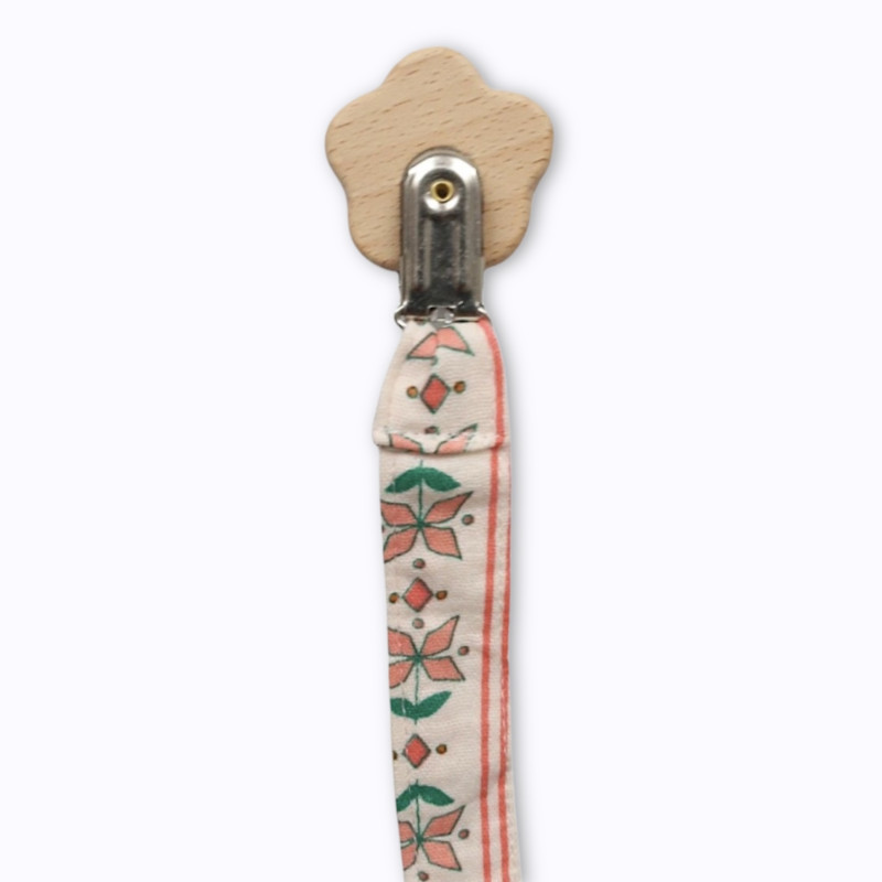 Fabriquée en coton doux avec un clip en bois solide, cette attache se fixe facilement sur un col, une salopette ou un doudou. La lanière est ornée d’un joli imprimé fleuri aux nuances estivales. La petite fleur brodée ajoute une touche délicate qui séduit les parents comme les enfants.