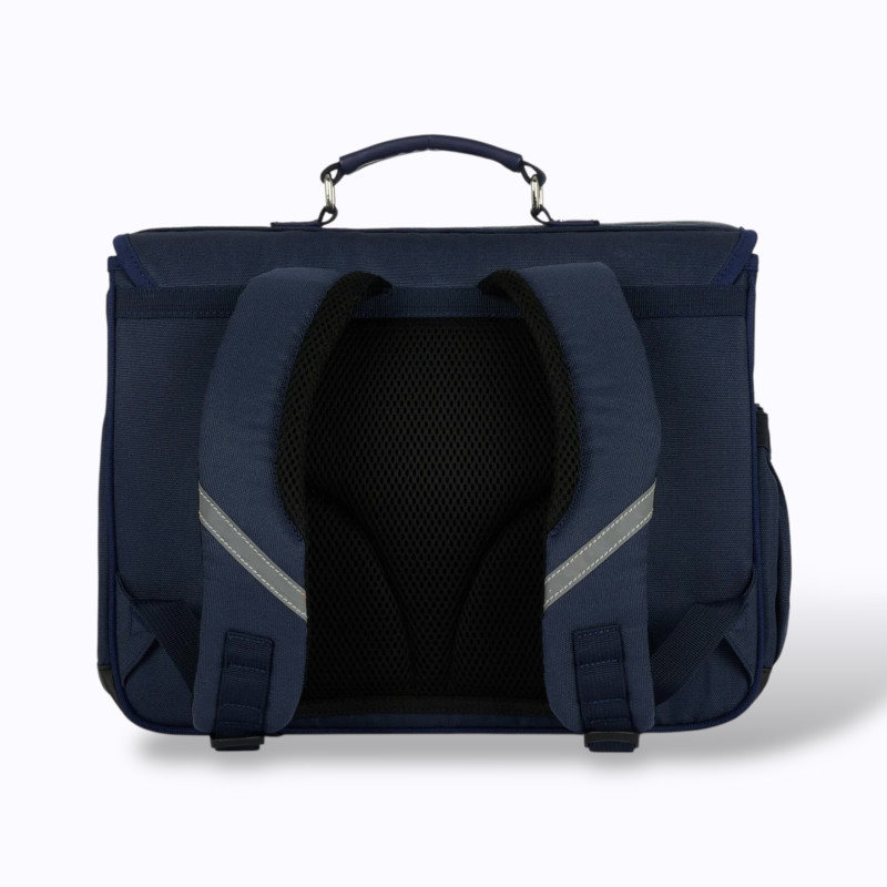 Le dos matelassé et les bretelles ergonomiques assurent un confort optimal, même quand le sac est bien rempli. Les bandes réfléchissantes renforcent la visibilité sur le trajet de l’école.