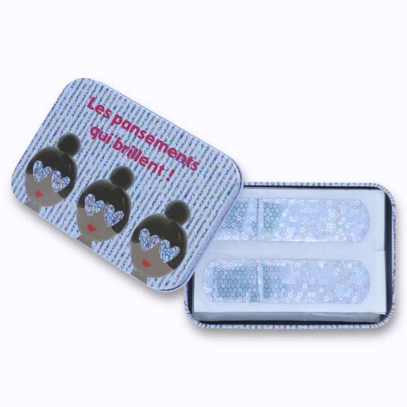 Cette boîte de pansements paillettes complète idéalement la boîte de pansements véhicules et chiens. Ces modèles amusants permettent aux enfants de choisir leur pansement préféré et de se sentir mieux rapidement après un petit bobo.