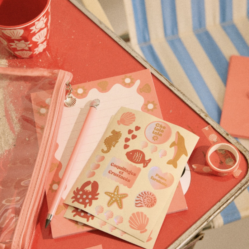 Ce set comprend des lettres, des enveloppes et des stickers assortis, le tout inspiré de l’univers espiègle de la collection Trouville. Les motifs graphiques et colorés apportent une touche de fantaisie à chaque message. Dans la même collection, la gomme fleurs rouges rayée Le Petit Souk reprend ces codes ludiques et poétiques, parfaite pour compléter ce set.