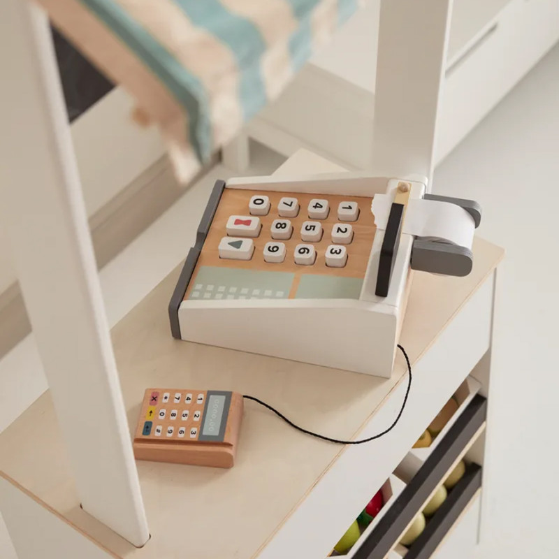 La caisse enregistreuse est entièrement fabriquée en bois peint à l’eau. Son style scandinave et ses tons pastel en font aussi un bel objet déco. Elle résiste à toutes les histoires de marché, de magasin bio ou de superette de quartier. Et quand on en a assez de jouer, elle attend sagement sur une étagère.