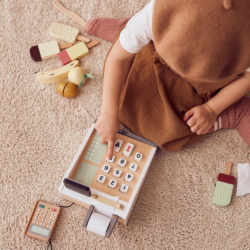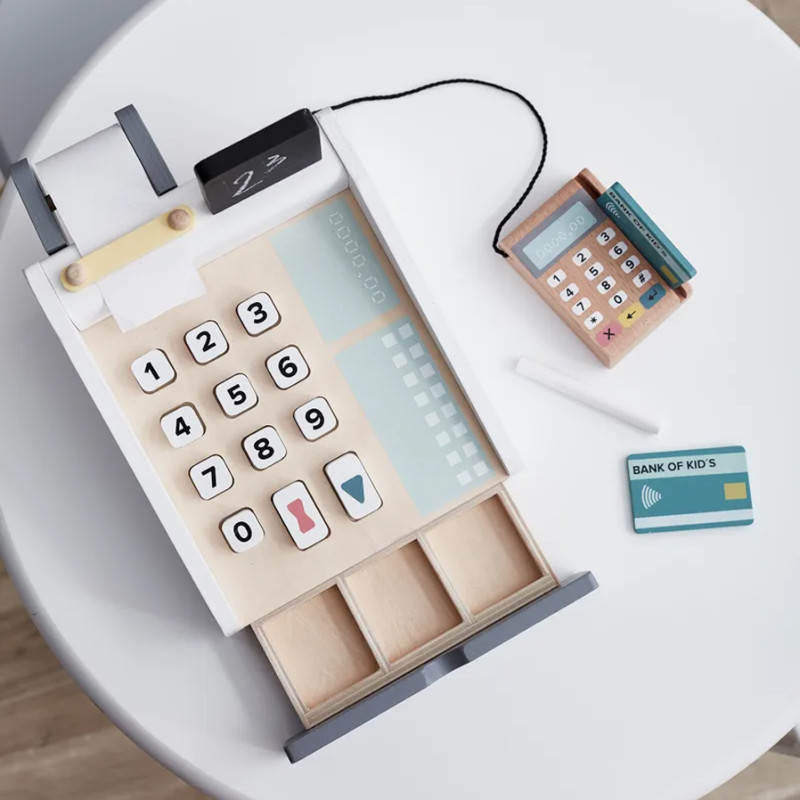 À chaque passage en caisse, une nouvelle histoire se glisse dans la file d’attente. L’enfant appuie sur les touches, fait glisser une carte, compte les pièces en bois. Le tiroir s’ouvre vraiment et les billets se rangent comme dans une vraie boutique. Les jeux d’imitation deviennent plus vrais que nature.
