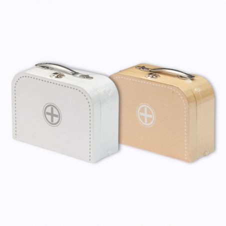 Cette malette en bois et tissu se transporte très facilement. Elle s’ouvre largement pour accéder à tout le matériel, puis se referme pour emmener la clinique partout. Les couleurs douces et le design scandinave en font un bel objet qui traverse les âges.