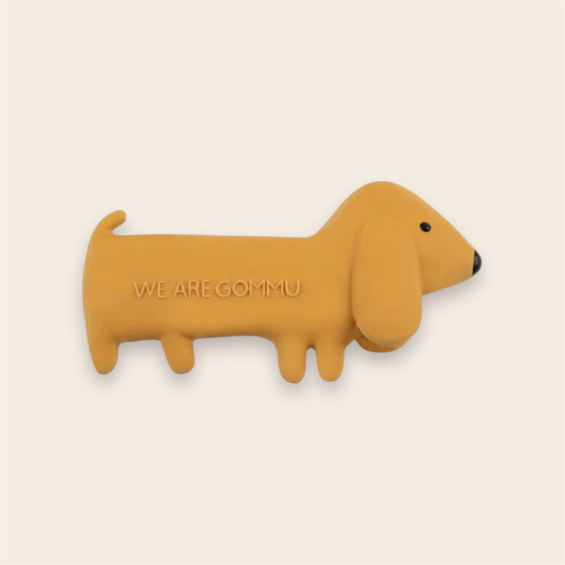 Le Mini Dog Sienna de la marque We Are Gommu est un jouet de dentition en forme de petit chien, conçu pour accompagner les tout-petits dès la naissance dans leur découverte sensorielle. Fabriqué à la main en Espagne, il est confectionné à partir de caoutchouc naturel, issu de la sève blanche d’hévéa. Sa composition 100 % biodégradable reflète l'engagement de la marque pour des jouets écologiques et durables.