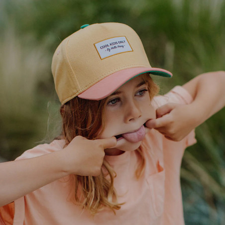 Les teintes rosées de la visière fusionnent délicatement avec le beige très clair de la calotte, créant un rendu doux et raffiné. La broderie « Cool Kids Only » apporte une touche malicieuse pour les tous-petits stylés. Pour une alternative dans des tons similaires, la casquette enfant Mini Beige Hello Hossy reste dans la nuance douce et minimaliste.