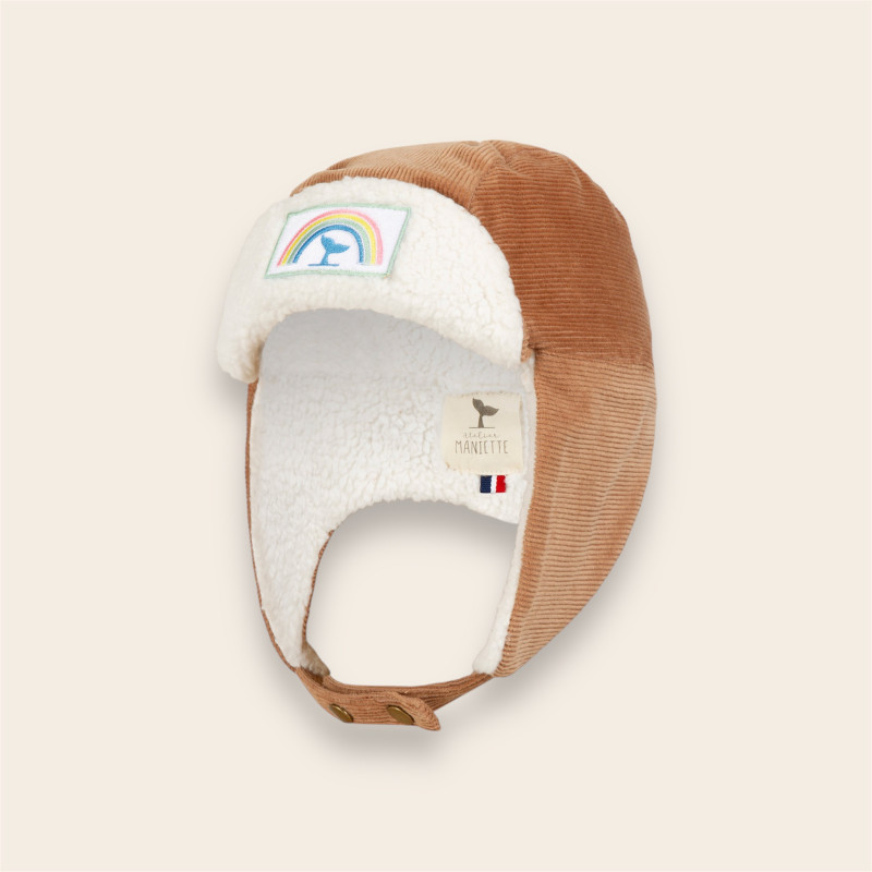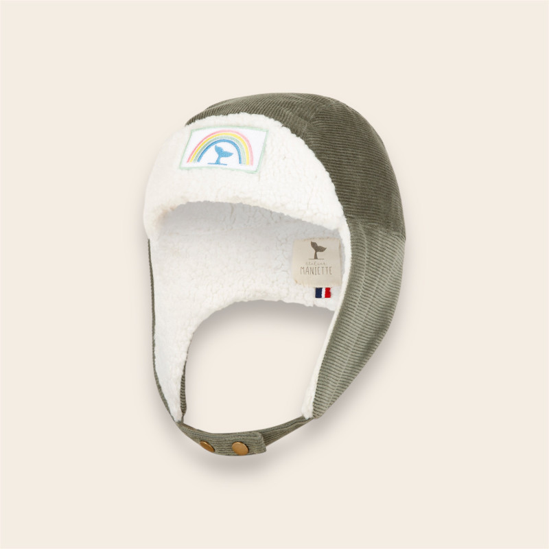 PAULA la chapka upcyclée d'Atelier Maniette en kaki et noisette, respire et protège les oreilles du froid avec son côté moumoute écrue et son velours upcyclé. Disponible en tailles 2-4 ans et 7-9 ans.