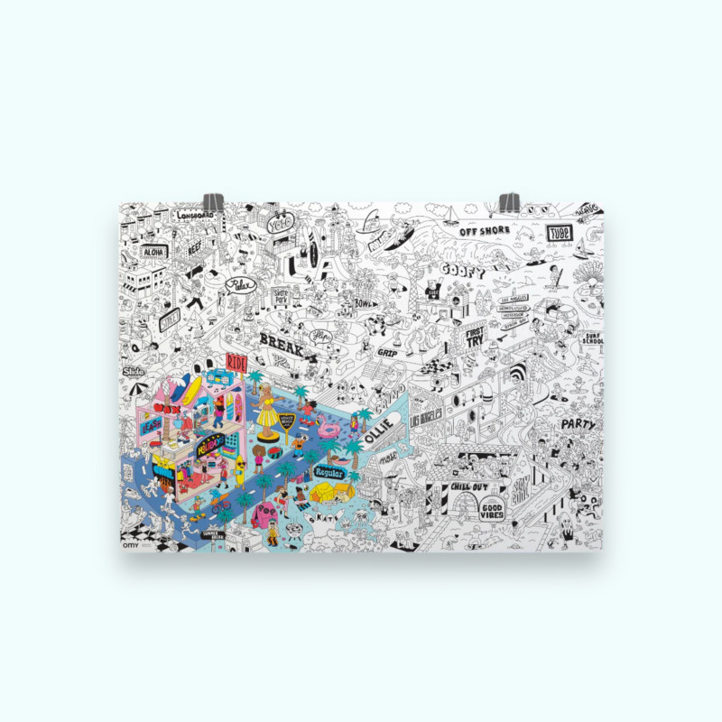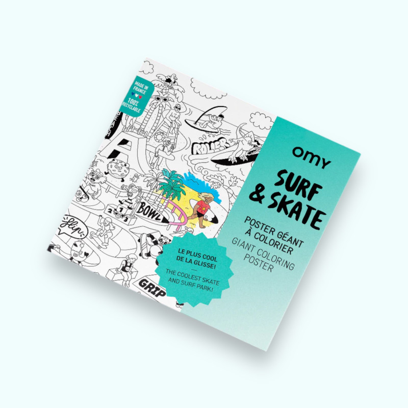 Le poster à colorier Surf & Skate d'OMY vous plonge dans l'univers dynamique des skateurs et surfeurs de la côte ouest ! Avec un trait plein d'humour et une multitude de détails, il promet un voyage graphique amusant à partager.