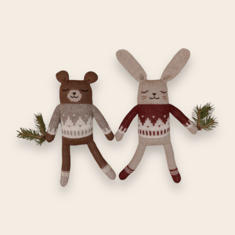 Rencontrez le Doudou ourson de Main Sauvage, un adorable compagnon conçu pour apporter chaleur et confort à votre tout-petit. Tricoté à la main dans un atelier équitable en Bolivie, cet ourson a revêtu son plus beau pull pour offrir une sensation cocooning parfaite à la maison. Fabriqué en pure laine baby alpaga, il est incroyablement doux et agréable au toucher, ce qui en fait un partenaire de câlins idéal.