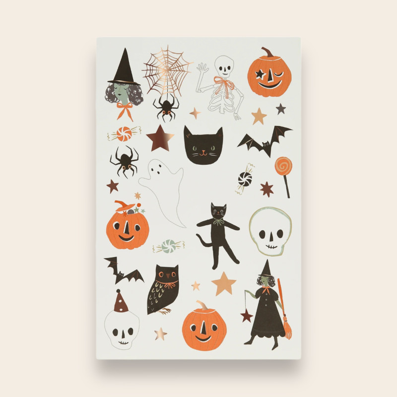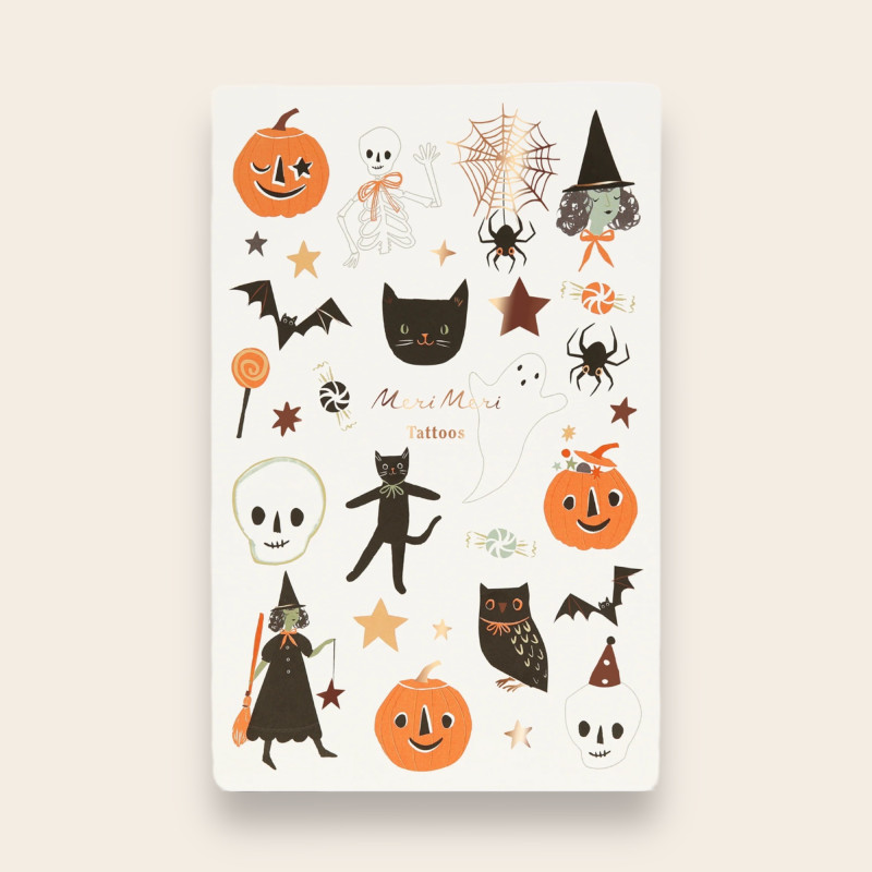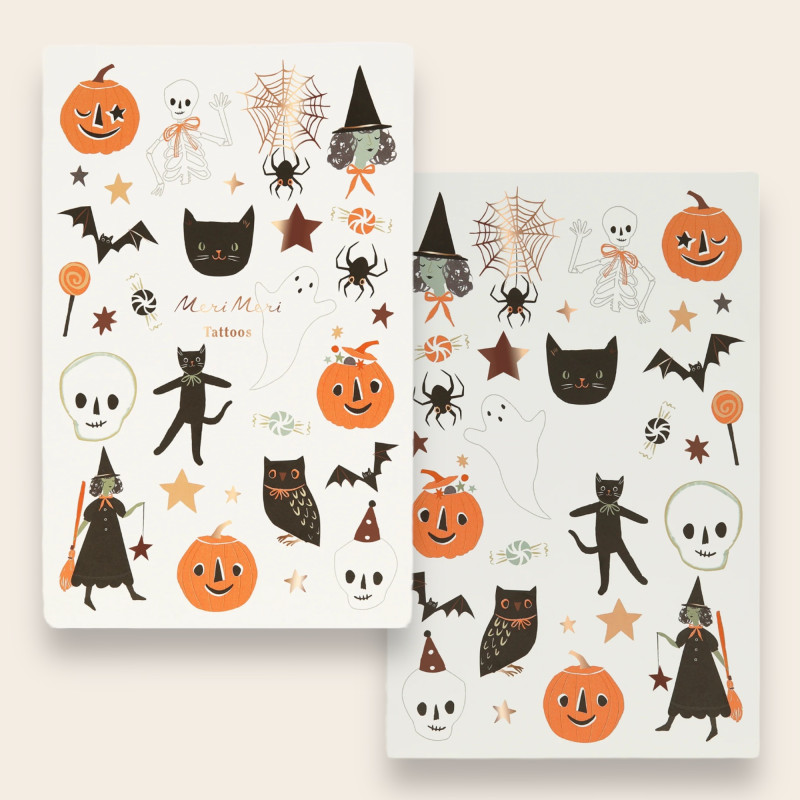Plongez dans l’univers fantastique d’Halloween avec les Tatouages temporaires de Meri-Meri, spécialement conçus pour faire briller les petits comme les grands ! Ce lot comprend deux feuilles de tatouages temporaires représentant des personnages emblématiques d'Halloween, tels que des fantômes, des citrouilles, des sorcières, et bien plus encore, tous illustrés avec une touche amusante et féérique. Les enfants adoreront ces créations effrayantes mais adorables, qui les transporteront immédiatement dans l’ambiance festive d’Halloween.